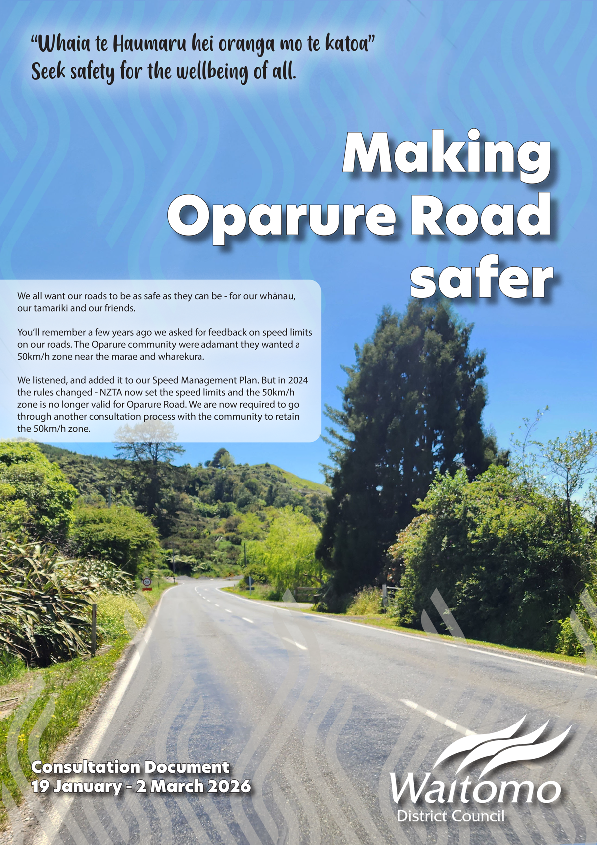 Waitomo District Council is proposing to change the existing 80km/h speed limit on Oparure Road to 50km/h, approximately from 100m west of Fullerton Road to 600m west of Boddies Road intersections.