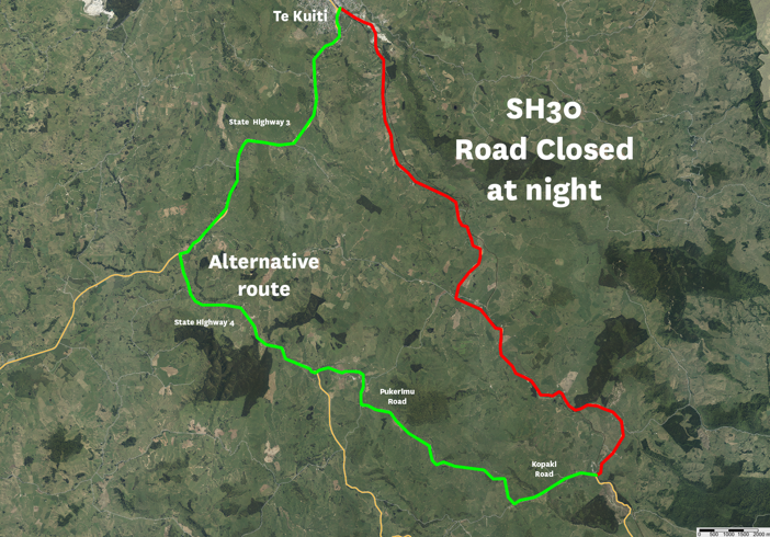 Due to ongoing road movement caused by the recent wet weather, State Highway 30 north of the Kopaki Bridge will be closed at night, until further notice.
