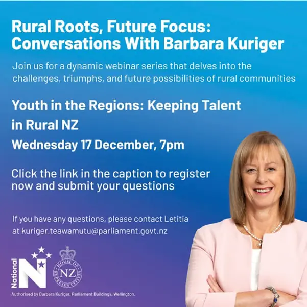How do we inspire young people to build their futures in rural New Zealand? Barbara Kuriger will lead a conversation on one of the most urgent challenges facing our regions: ensuring that talent is nurtured, supported, and retained outside the main centres.