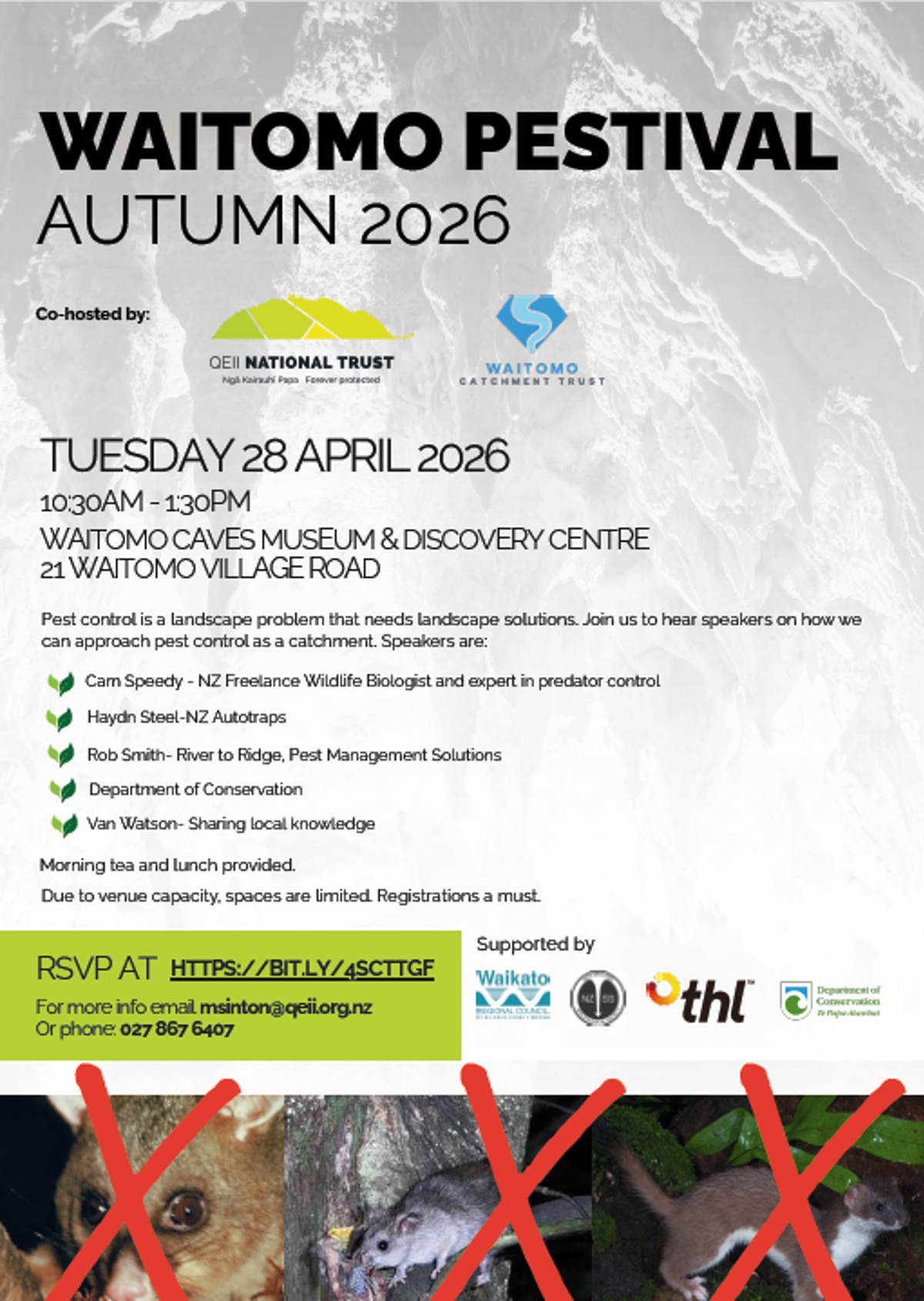 As a community member, you may be interested in an event about pest control in the Waitomo Catchment. The event is co-hosted by Waitomo Catchment Trust and QEII National Trust.