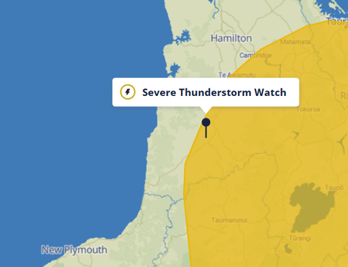 - A severe thunderstorm watch has been issued by metservice, valid from 2am-9am, 29 January 2023. Some of these thunderstorms may become SEVERE, producing localised downpours with intensities of 25 to 40 mm per hour. Rainfall of this intensity can cause surface and/or flash flooding, especially about low-lying areas such as streams, rivers or narrow valleys, and may also lead to further slips. Driving conditions will also be hazardous with surface flooding and poor visibility in heavy rain.