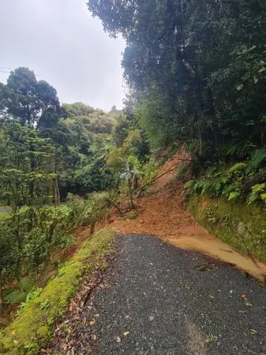 HAUTURU ROAD: One lane is closed on Hauturu Road, Te Anga, about 500m from Te Anga Road, due to a slip. Please take care. An orange netting fence will be erected to provide further visual warning to road users. Repairing this will not be a quick fix.