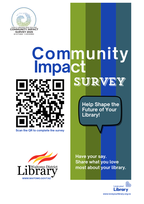 We'd love your help! Public Libraries NZ is running a Community Impact Survey, and your feedback is incredibly valuable to us. You can complete the questionnaire by using the link below or picking up a printed copy from the library.